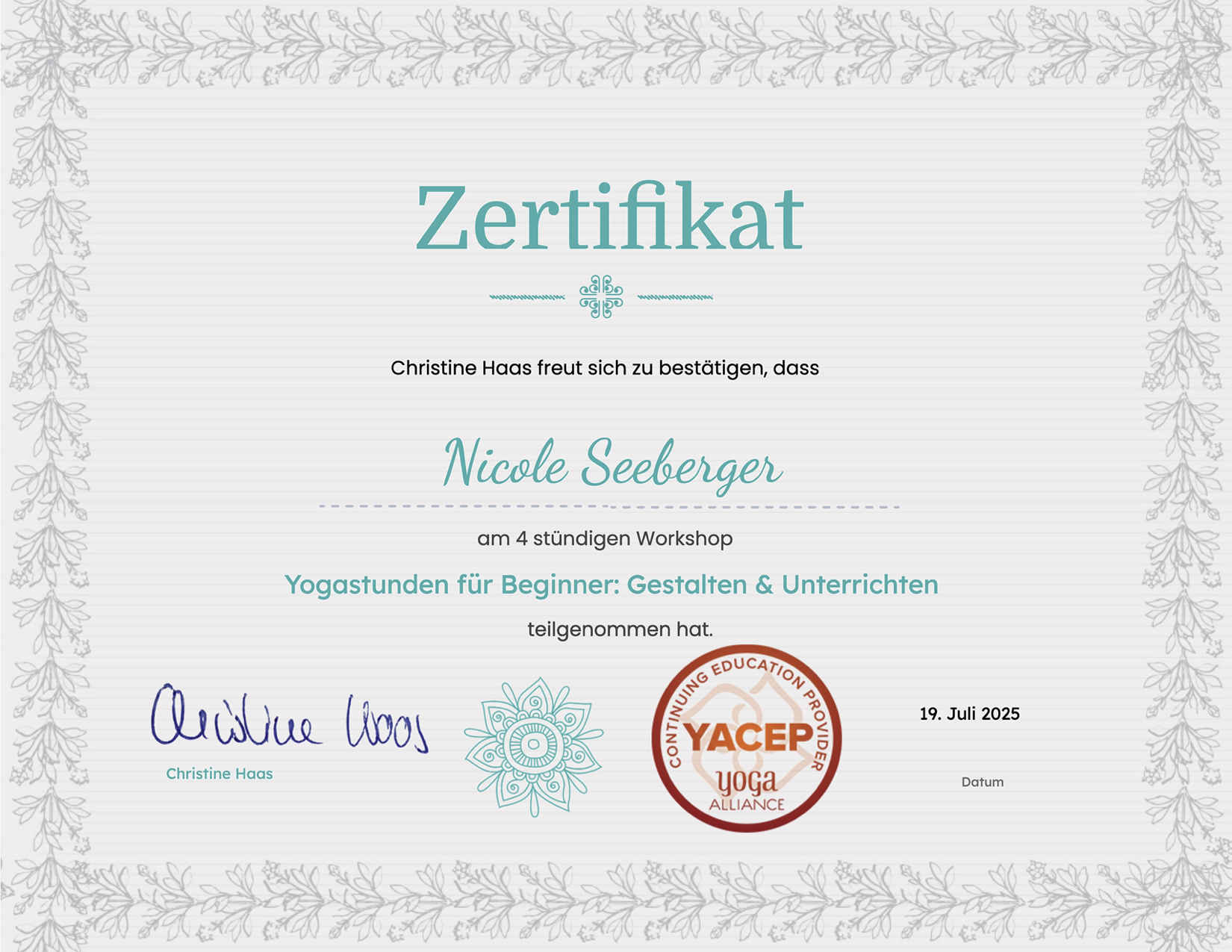 von Herzen danke ich euch für eure inspirierende Begleitung auf meinem Yogaweg. Eure Achtsamkeit, Geduld und Tiefe haben mir nicht nur neue Perspektiven eröffnet, sondern auch mein Vertrauen in mich selbst gestärkt. Jede Stunde mit euch war ein Geschenk – voller Klarheit, Energie und liebevoller Präsenz. Danke, dass ihr euer Wissen und eure Leidenschaft teilt und Räume schafft, in denen Wachstum möglich ist.